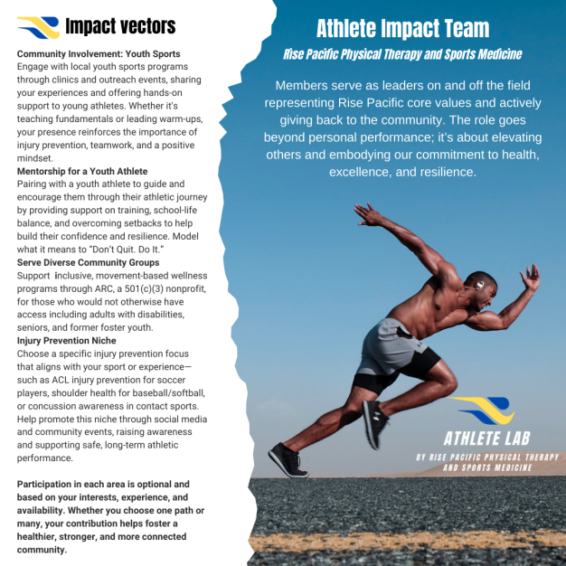 Members of the Rise Pacific Athlete Impact Team serve as leaders on and off the field representing Rise Pacific core values by actively giving back to the community. The role goes beyond personal performance; it’s about elevating others and embodying our commitment to health, excellence, and resilience.